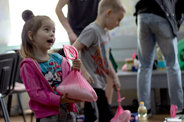 Die Leute kommen dann an ihrem Termin vorbei. Wir überprüfen, ob sie auch wirklich angemeldet sind und nehmen ihre Daten auf. Wir geben ihnen ein Hilfspaket und laden sie zu den Angeboten unserer Kirchgemeinde ein. Wir packen und verteilen jede Woche rund 300 Pakete für die notleidende Bevölkerung in Odessa. Ausserdem packen wir wöchentlich 70-100 Pakete und bringen sie nach Mykolaiv (rund 130 km von uns entfernt) und verteilen sie dort.