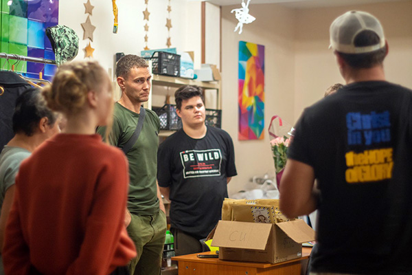 Drinnen im Zentrum erzählt uns der Leiter, was sie tun, wie ihr Alltag aussieht und wie sie den Krieg erleben. Die Volunteers sind junge Erwachsene, die sehr engagiert und dynamisch wirken und auch mal einen Spass machen und lachen. Dennoch ist in ihren Blicken eine grosse Leere und Ratlosigkeit zu entdecken. Ich erinnerte mich an das Wort aus der Bergpredigt. Jesus möchte durch seine Worte diesen jungen Menschen einen Wegweiser Richtung Freiheit und Frieden geben. Ich fühle mich nicht kompetent, diesen Leuten etwas über Freiheit und Frieden zu erzählen. Aber ich gebe ja diesen Menschen nicht meine eigenen Ideen und Konzepte weiter, sondern die Worte die Jesus uns gelehrt hat.