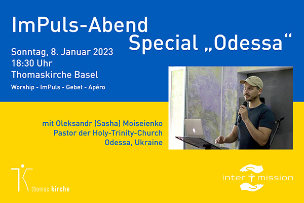 Am ImPuls-Abend vom Sonntag 8. Januar 2023 war Sasha Moiseienko aus der Ukraine Gast in der Thomaskirche in Basel. Er ist Pastor in der Holy Trinity Church in Odessa und berichtete von der aktuellen Situation in der Ukraine und über das Engagement der rund 20 freiwillig Mitarbeitenden. Wöchentlich versorgen sie über 200 Familien mit Lebensmitteln und Hygieneprodukten, engagieren sich für Flüchtlinge, die aus der Ostukraine nach Odessa gekommen sind und machen Hilfstransporte mit Lebensmitteln und Brennmaterial nach Cherson und weiteren Dörfern, die vor kurzen befreit worden sind.