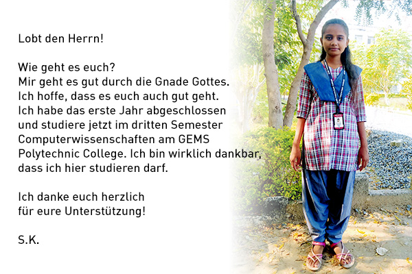Vor sechs Jahren wurde das GEMS Polytechnic College in Bihar eröffnet. Der Direktor Ashish Daniel bedankt sich mit einem Brief und einem Clip für alle Unterstützung und Verbundenheit.
